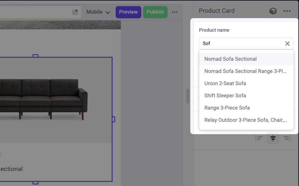A Combobox panel on a Product Card component to pick a product by name