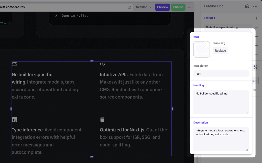 This example adds a Shape control to thetype field of a List control for a Feature Grid component.
