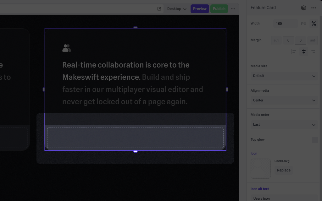 The following example adds a Slot control to themedia prop of a Feature Card component.